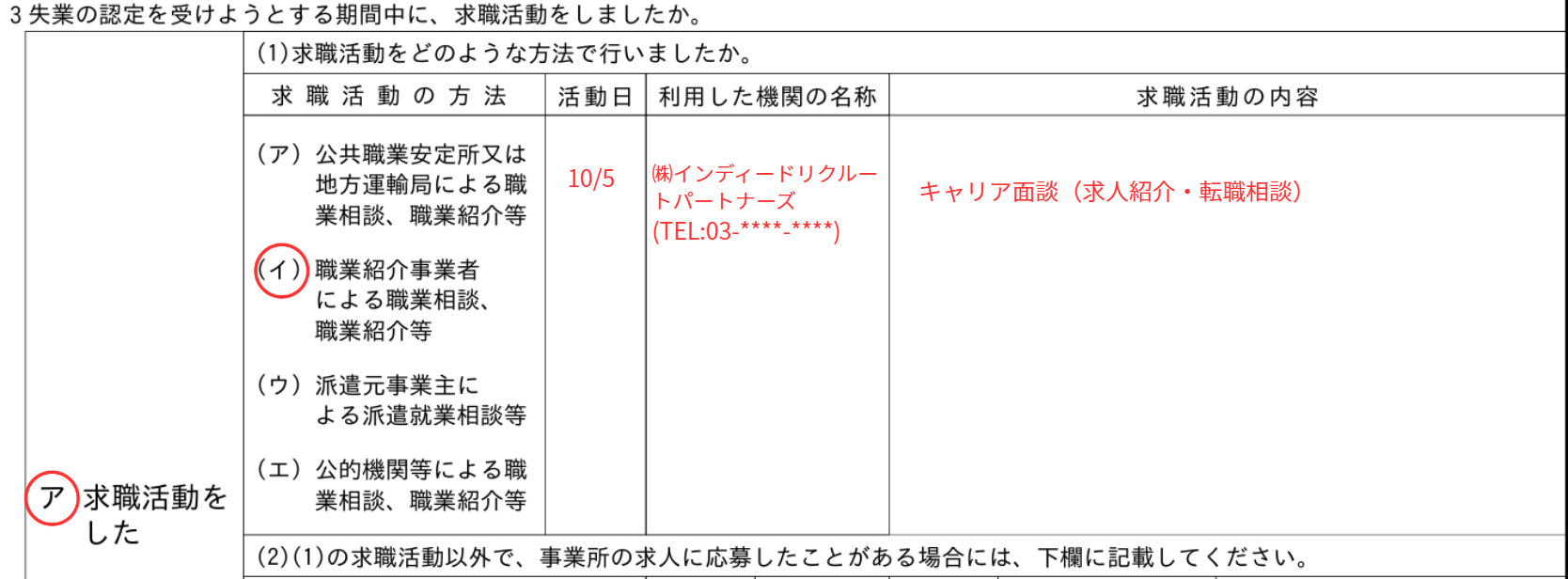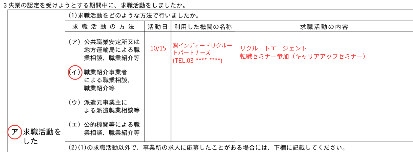 「就職活動」や「転職活動」など、具体的ではない表現は避けましょう。 「求人応募(株式会社〇〇)」や「職業相談(求人紹介を受けた)」というように、行動内容を具体的に記入してください。 - 「利用した機関の名称」の書き忘れ: